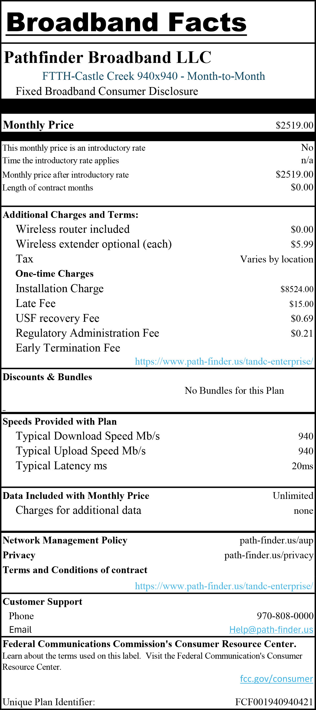FCF001940940421 – FTTH-Castle Creek 940/940 – Month to Month
